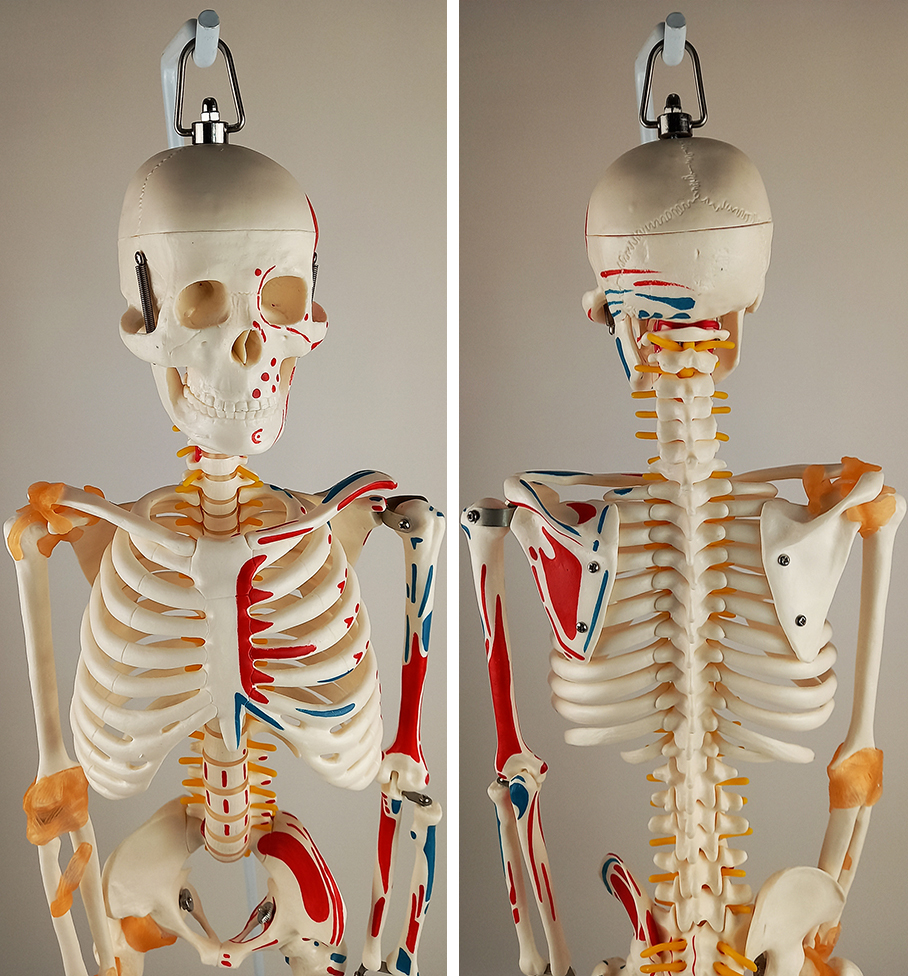 (Гнущийся позвоночник + раскрашенные кости + обозначение мышц суставов).